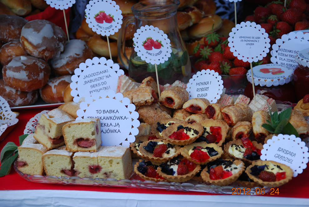 Najważniejszym punktem imprezy są jednak owoce, a te można spotkać na truskawkowych stoiskach sołectw i to w najlepszym wydaniu. Nawet najwięksi smakosze będą usatysfakcjonowani tak wielką ilością rozmaitych potraw przyrządzonych z truskawek. Ciastka, ciasteczka, naleśniki, pierogi, musy, sałatki czy nalewki kuszą wspaniałym smakiem i aromatem.
